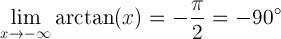 The limit of arctangent of x when x is approaching minus infinity is equal to -pi/2 radians or -90 degrees: