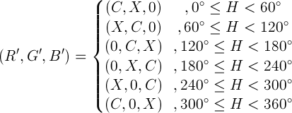 X = C × (1 - |(H / 60°) mod 2 - 1|)