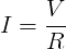 The resistor's current I in amps (A) is equal to the resistor's voltage V in volts (V) divided by the resistance R in ohms (Ω):